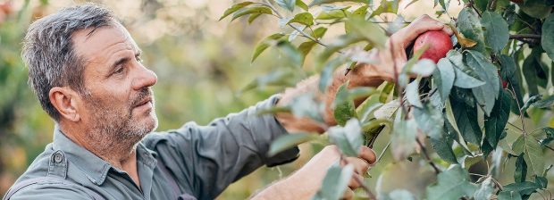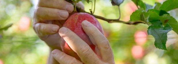 Der Apfelbauer nimmt jeden Apfel vorsichtig in die Handfläche und dreht ihn mit einer Kippbewegung nach oben. Dann löst er den Apfel samt seinem Stiel vom Zweig und legt ihn behutsam in eine Kiste. Alle Pflücker sind in dieser traditionellen Technik ausgebildet.