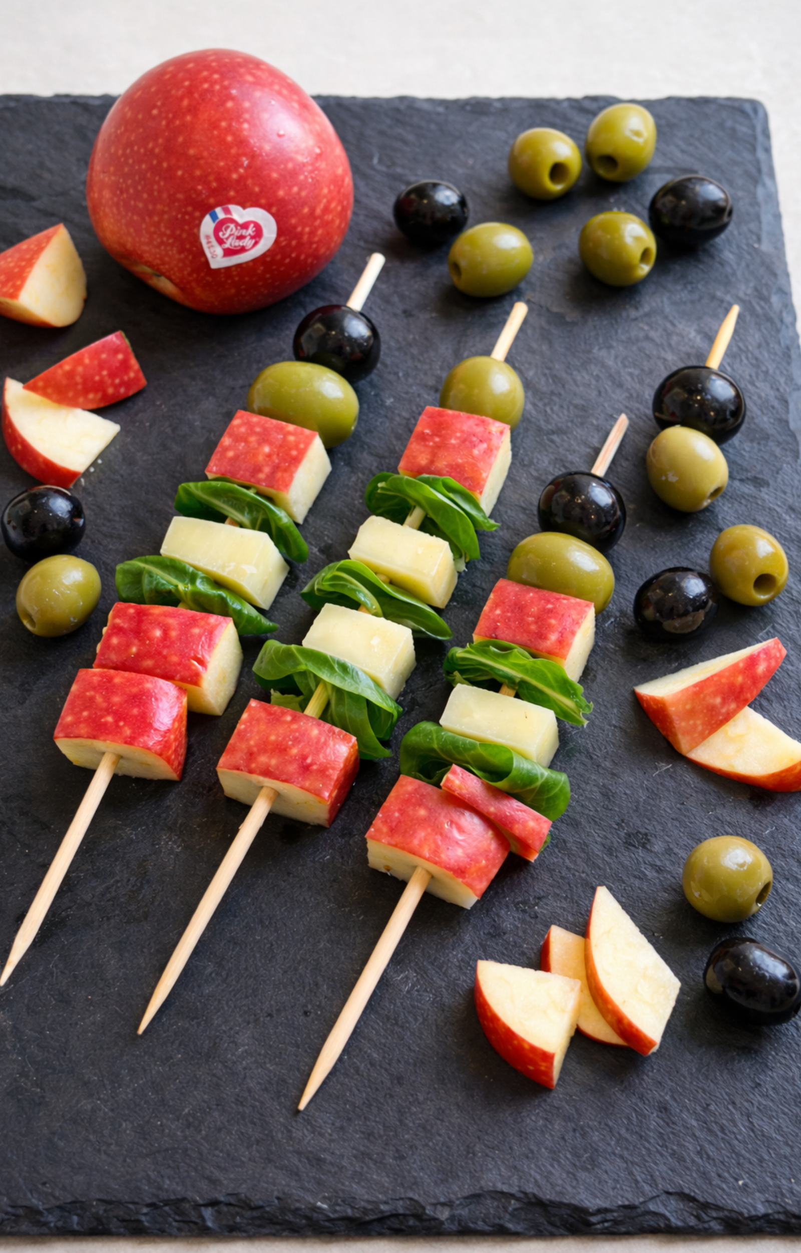 - Für einen gelungenen gesunden Appetithappen zum Apero, die Pink Lady®-Apfelspieße mit einigen Scheiben Toast und Tapenade servieren!