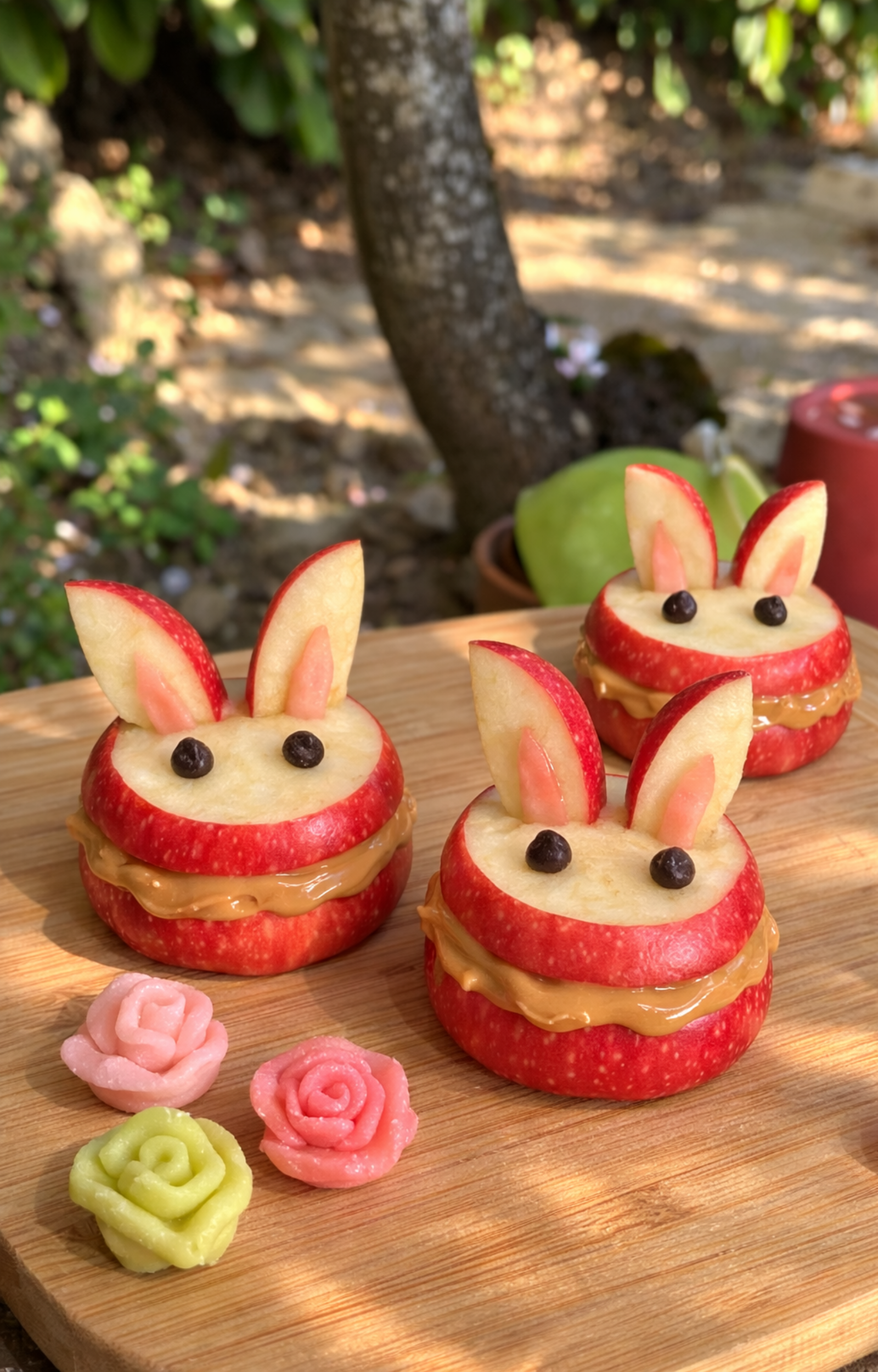 - Aus weiteren Apfelstücken ovale Formen ausschneiden, um daraus die Ohren des Hasen zu formen, und zum Schluss die Innenseite der Ohren mit einem Stück Marzipan verzieren.