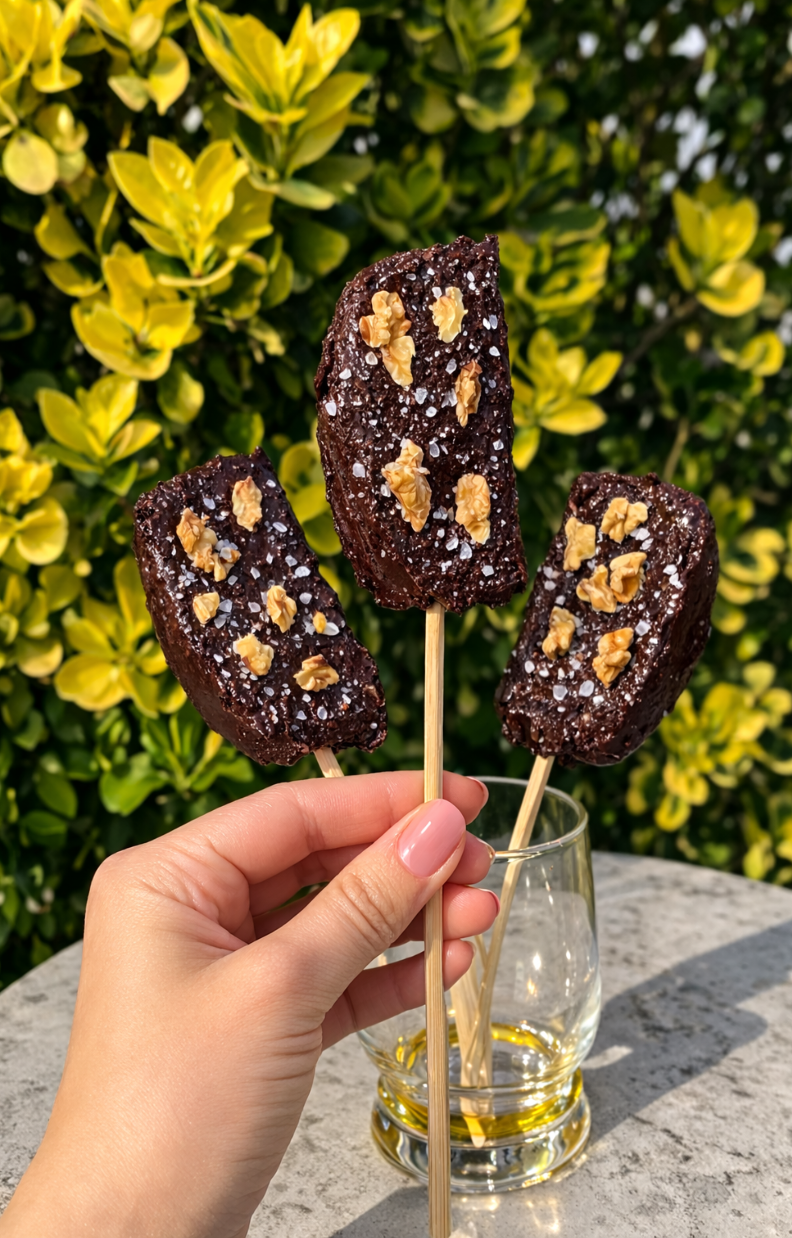 - Zum Schluss die Schokoladen-Apfelspieße mit Nussstückchen und etwas Fleur de Sel garnieren, bevor die Schokolade fest wird.