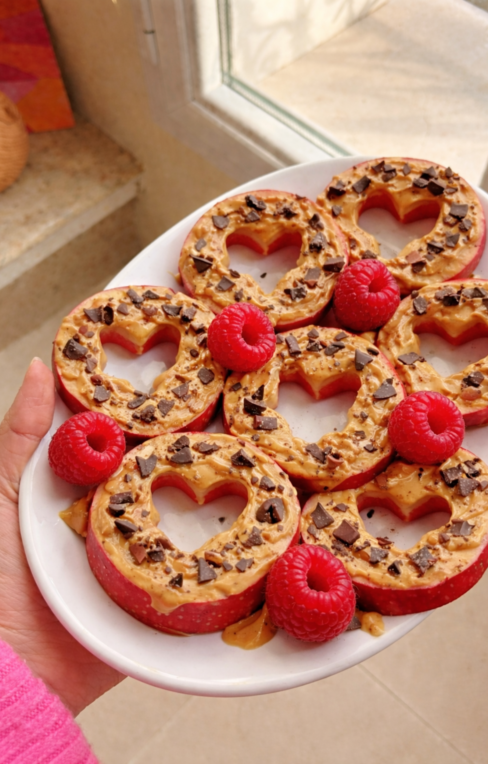- Danach eine Schicht Erdnussbutter auf die Apfelscheiben streichen.